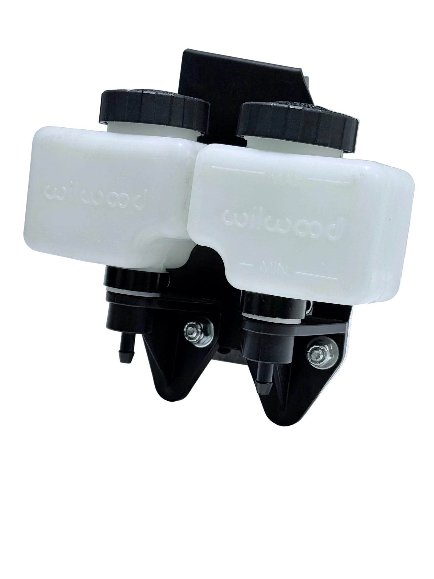 Looking for a cost effective way to relocate your brake fluid reservoirs, when moving the master cylinder under the dash? We have you covered with our Anodized Black Aluminum Mount. All of our pedal assembly kits come standard with the plastic tanks and rubber hose. So, in this kit we will provide our Aluminum Mount and necessary hardware to mount the tanks to our mount and (2) -3AN female to 1/4" male barb fittings and (4) hose clamps. The fittings are intended to go on the -3AN male fittings on our Fluid Pass Through Outside Firewall Mount, allowing for a smooth transition to the rubber hose. The four hose clamps are used where the rubber hose slips over the four barbed nipples.